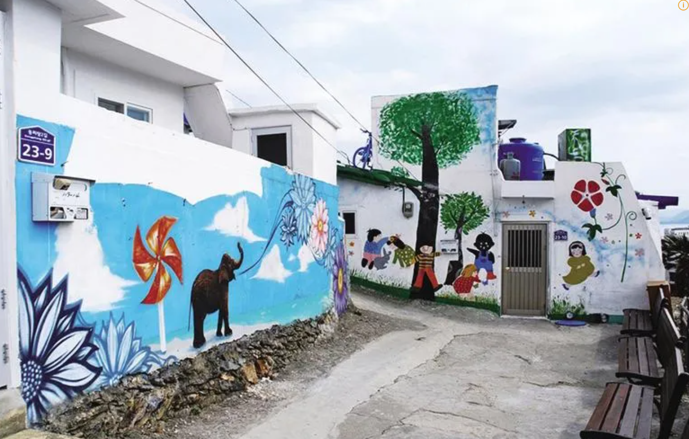 ㅇ 동피랑: 중앙시장 뒤쪽에 있는 마을로 벽화가 유명하며 가파른 언덕이라는 뜻이나, 획기적인 발상을 하여서 인기있는 장소로 탈바꿈했다.