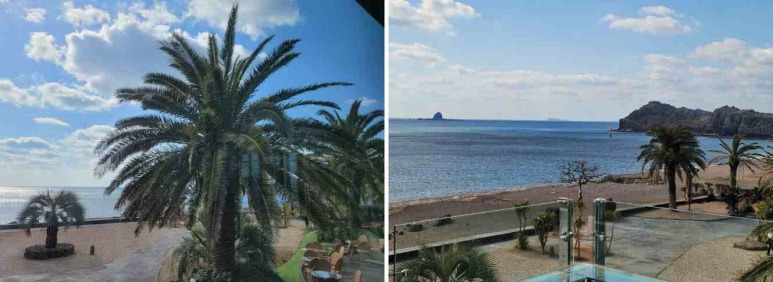 🔹 분위기 및 인테리어: 카페 내부는 제주도의 자연과 어울리는 검은색 계통의 아늑한 분위기를 자랑합니다. 넓은 유리창을 통해 산방산과 화순 바닷가의 경치를 한눈에 볼 수 있으며, 따뜻한 남국의 야자수와 현무암으로 꾸며진 인테리어가 편안한 느낌을 줍니다. 🌄