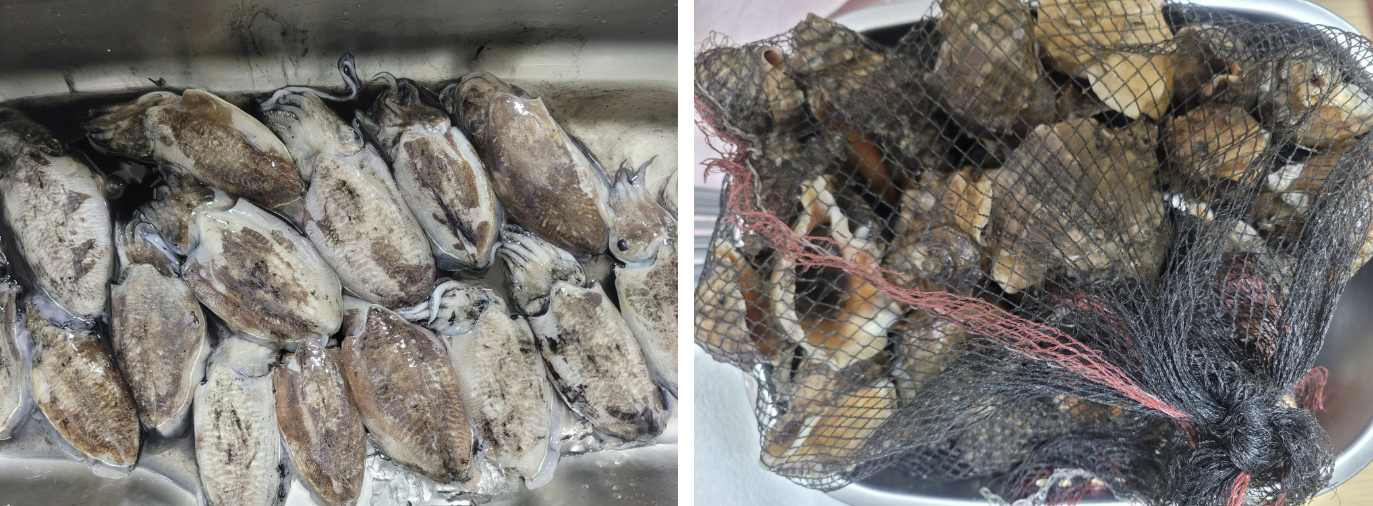 갑오징어는 몸통이 두툼하고 탄력이 살아 있는 것이 좋고, 알이 꽉 찬 시기엔 껍질 안쪽이 살짝 노르스름하게 보여요. 소라는 껍질이 단단하고 뿔이 깨지지 않은 것을 고르면 신선도가 높습니다. 아주 싱싱해 보이지 않나요!