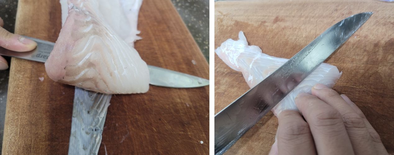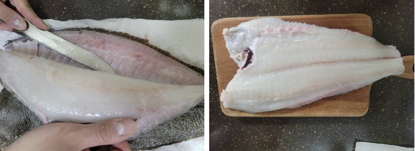 → 키친 페이퍼로 물기를 꼼꼼히 닦아낸 뒤, 양면을 필레 형태로 떼어냅니다.