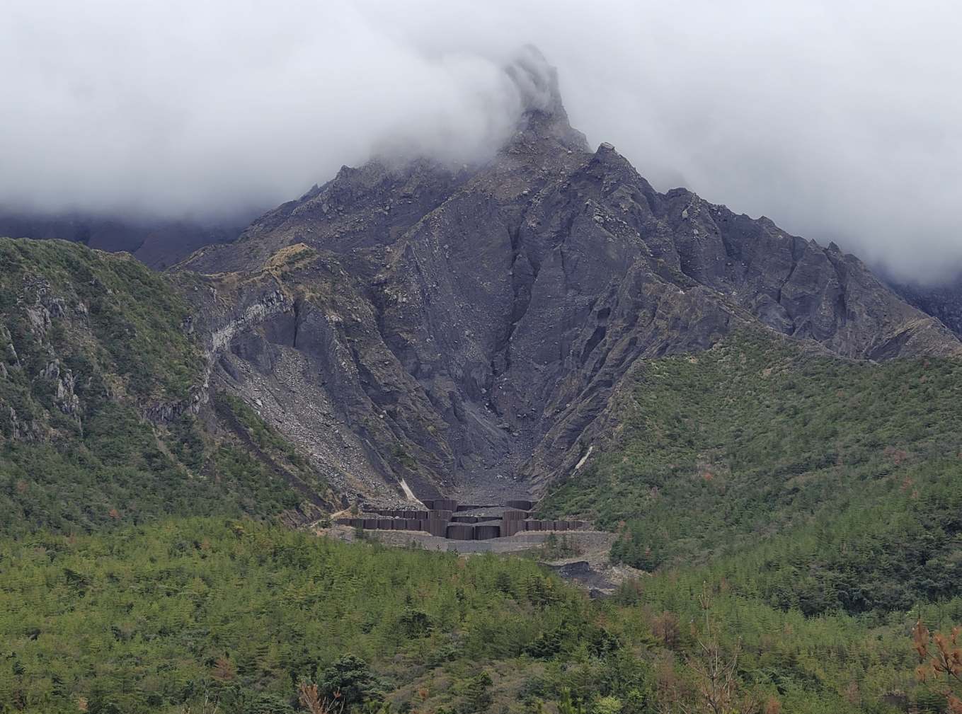 유노히라 전망대에서 본 과거 분화구인데요. 지금은 활동을 하지 않아서 흙도 약간은 갈색으로 변했고 분화구의 모습도 아주 무섭게 보이지는 않았어요. 그래도 산 정상 부근의 움푹패인 골짜기가 마치 지옥문으로 들어가는 입구 같았어요!!