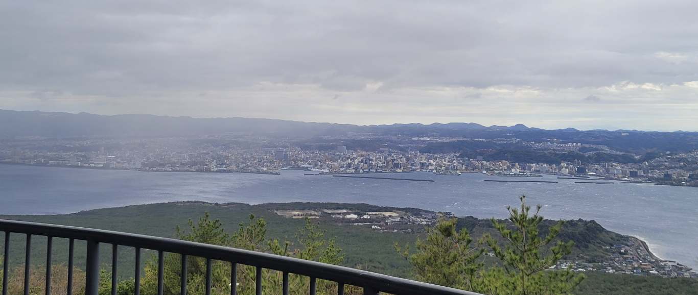 가고시마 시내부터 만 입구의 이부스키시까지 멀지만 어느 정도는 볼 수가 있어요. 동남쪽으로 가루미주시, 가노야시 및 최남단 곶부리인 사타미사키 공원까지, 가고시마 만 전체가 어렴풋이 보입니다.