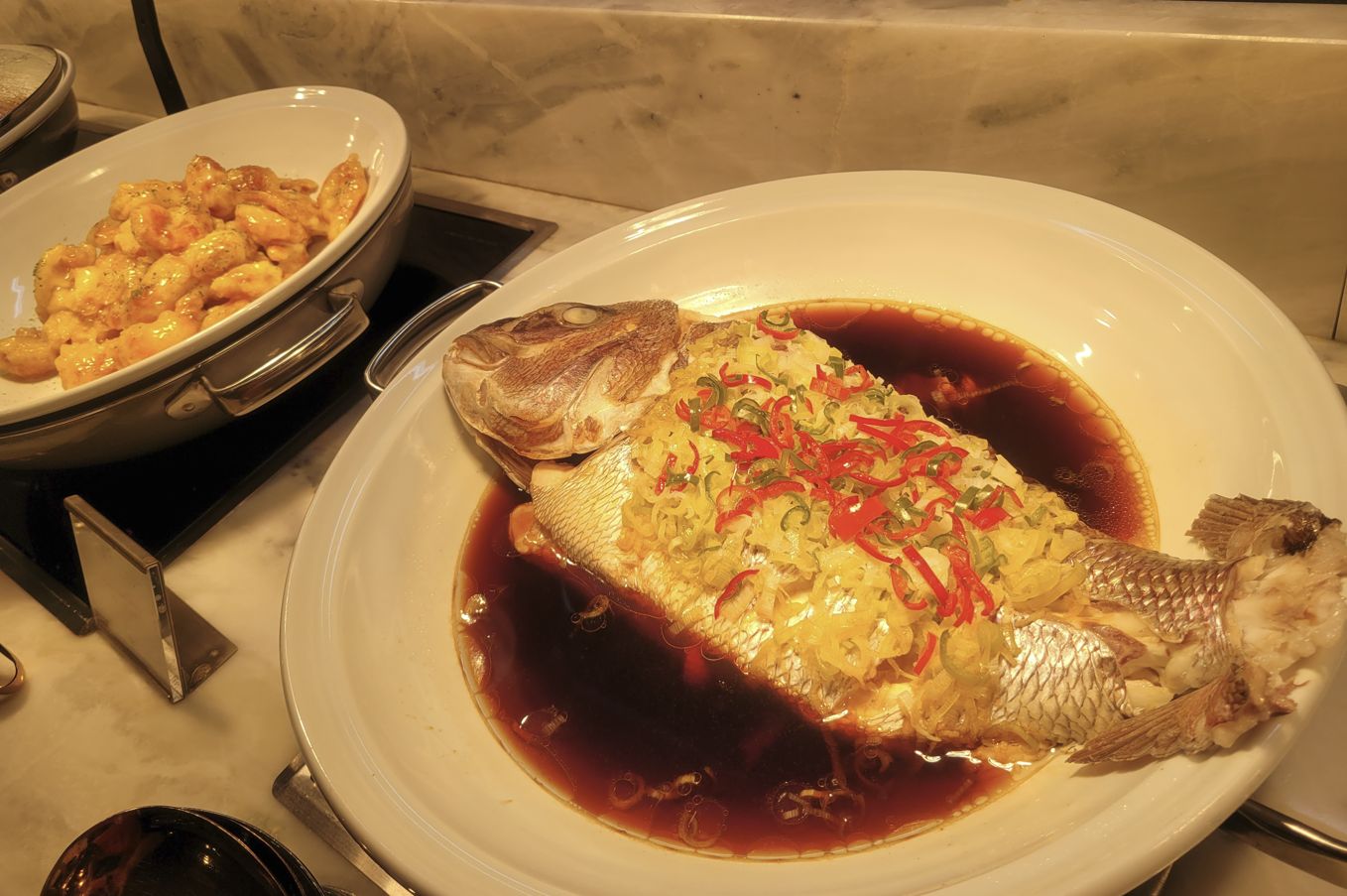 생선전은 부드럽고 기름이 깨끗한 느낌이었고 참돔 통찜은 비주얼이 강력했으며 담백한 맛이었죠. 인삼과 오징어 튀김은 후식으로 더 먹고 싶은 맛이 었고 한식의 섹션은 자극적이지 않고 깔끔한 스타일이라 해산뭉에 지친 입맛을 잠시 쉬어가기 좋았어요.
