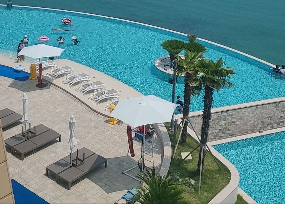 바로 옆은 바다와 맞닿은 것처럼 멋지게 위치한 수영장! 하루종일 아이들의 노는 소리가 재잘거리고 웃음 소리가 끊이지를 않지요. 한번 물 속으로 풍덩하고 싶지 않나요?