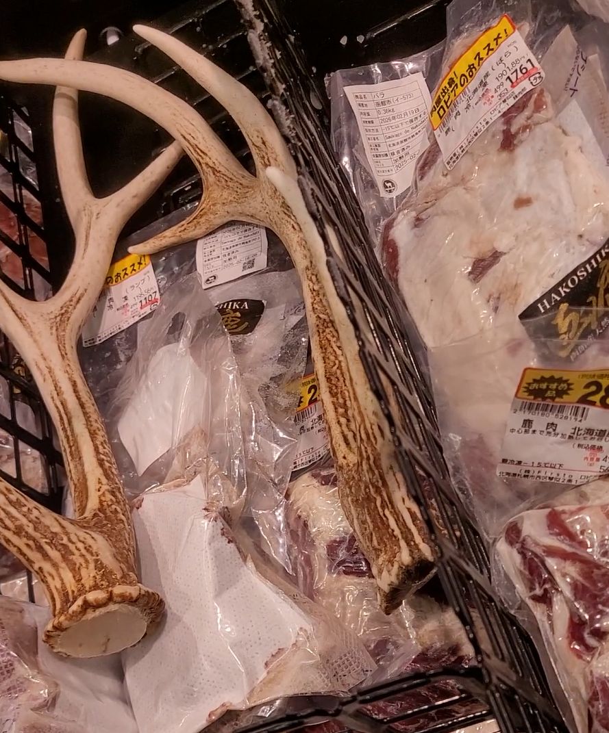 특별한 식재료를 판매하는 구역이 간단 조리 식품이 진열된 매장의 중앙에 자리잡고 있었는데, 글쎄 사슴 뿔이 보이는 것이었습니다.