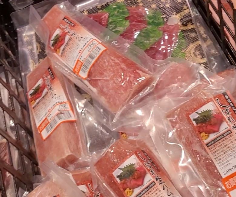 말고기는 냉동된 상태로 참치회처럼 가지런히 놓여 있었고, 횟감용이라는 표시가 눈에 띄었습니다.