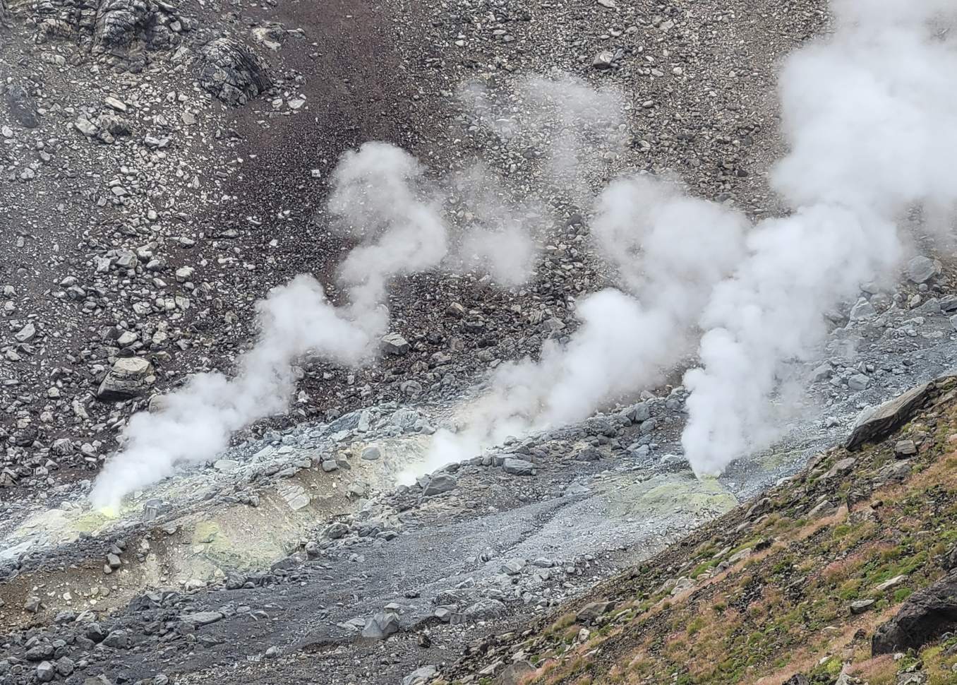 정상 부근에서는 수십 개의 작은 화산 분기공이 쉬익 쉬익 소리를 내며 뜨거운 열기를 뿜어내고 있었습니다.
