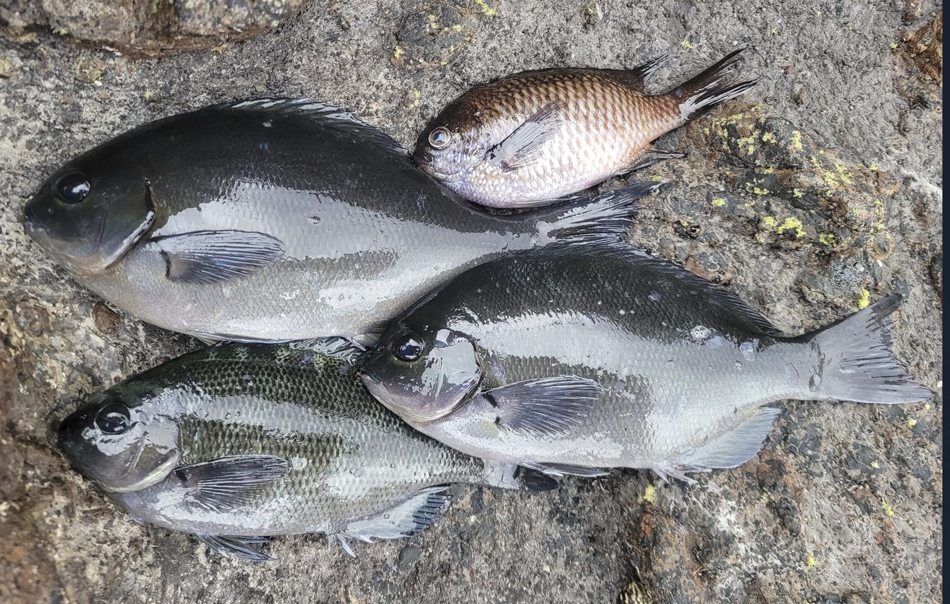 하지만 태평양의 대물은 쉽게 얼굴을 보여주지 않았고, 이날의 조과는 작은 벵에돔 3마리와 자리돔 1마리. 모두 3짜 크기지만, 소중한 생명들이 더 크고 건강하게 자라길 바라는 마음으로 모두 방생했습니다. 🐟💨