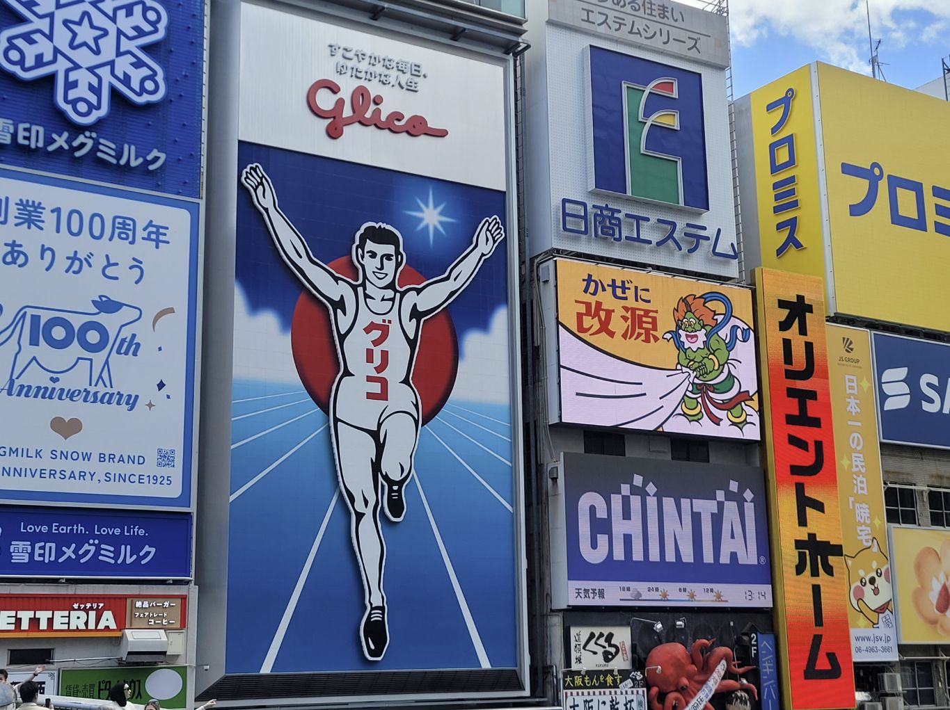 도톤보리 거리의 대표적인 인증샷 명소예요. 글리코 제과점의 캐릭터 인데 너무 유명해져서 오사카를 대표하는 상징이 되었습니다. 마라톤을 완주한 뒤의 기쁨에 가득한 미소인 듯 넘 멋진 포즈입니다.