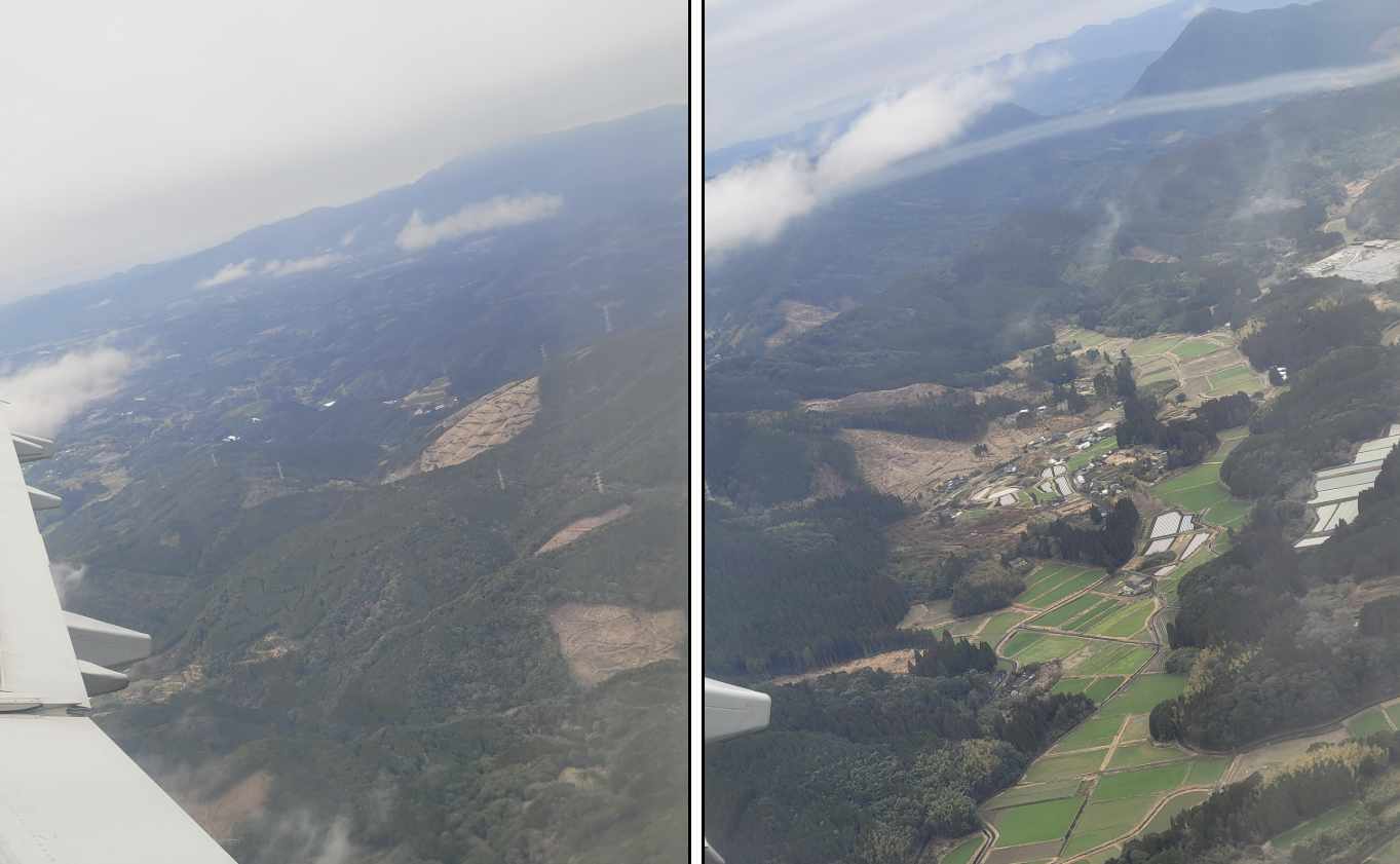 인천 국제공항에서 출발한 비행기는 부산의 신항을 지나 구름 잔디 위를 유유히 날아서 쓰시마와 히라도시를 통과했어요. 이후 짬뽕으로 유명한 나가사키시 상공을 거쳐 갑자기 높은 산맥들로 둘러 쌓인 산속을 비행했어요.