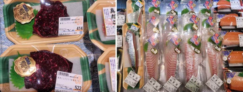 사시미와 스시는 선도도 괜찮고 가격도 합리적이라 사 먹기에 무리가 없습니다. 특별 상품인 고래고기가 다양한 부위로 정리되어 있고 가격이 높지 않아 별미로 먹을 만합니다.