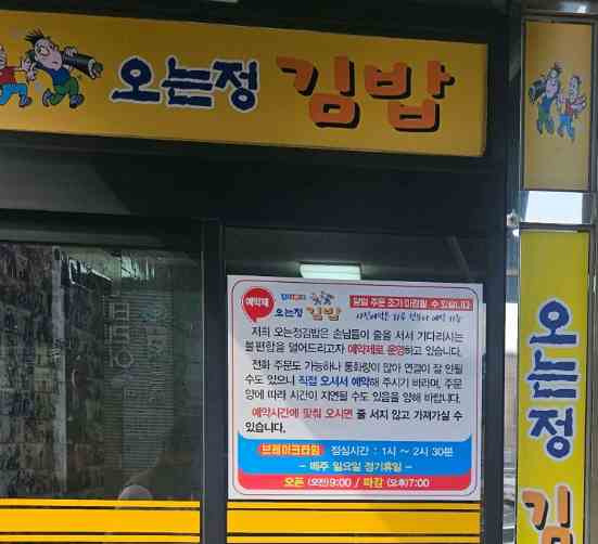 오는정김밥 (달콤 짭짤한 특제 양념으로 유명한 인기 김밥), 치즈김밥, 참치김밥, 멸치김밥, 떡갈비김밥, 기본 반찬과 따뜻한 국물 서비스 제공