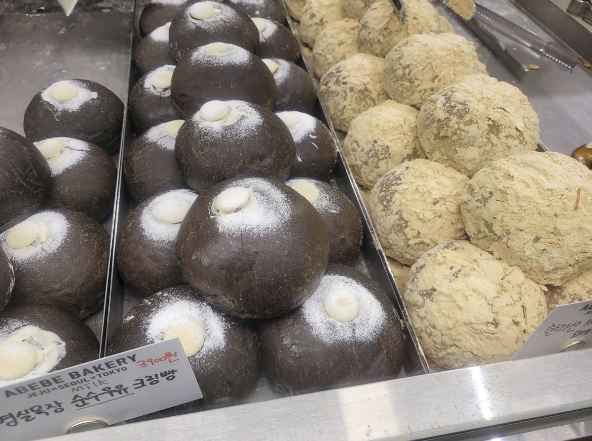 영실 우유 크림빵, 제주 쑥 단팥빵 등 이름만 들어도 제주 느낌이 물씬 나는 빵들이 줄지어 있었어요. 🌿