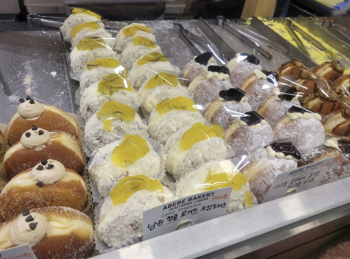 공항에서 쉽게 접할 수 있는 일반적인 간식과는 달리, 남원 청귤 도너츠, 산방산 고구마 도넛츠, 금능 사과 크림빵, 영실 우유 크림빵 등 제주 지역 이름과 재료를 담은 빵들은 여행의 시작부터 제주 분위기를 느끼게 해주었습니다. 🌿