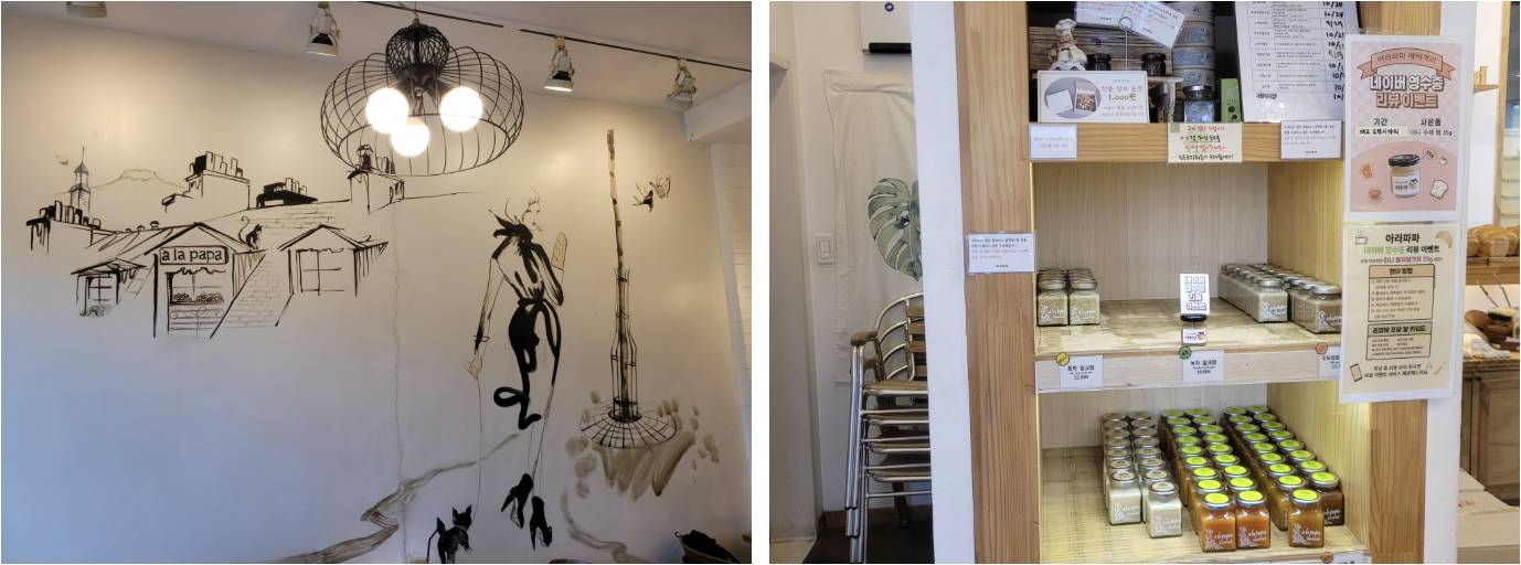 아라파파는 크진 않지만, 깔끔하고 아기자기한 실내 장식 덕분에 편안한 느낌을 주는 공간이에요. 테이블과 의자 배치는 조금 여유 없지만, 친구와 수다를 떨거나 혼자 커피 한 잔 즐기기에도 좋아요.