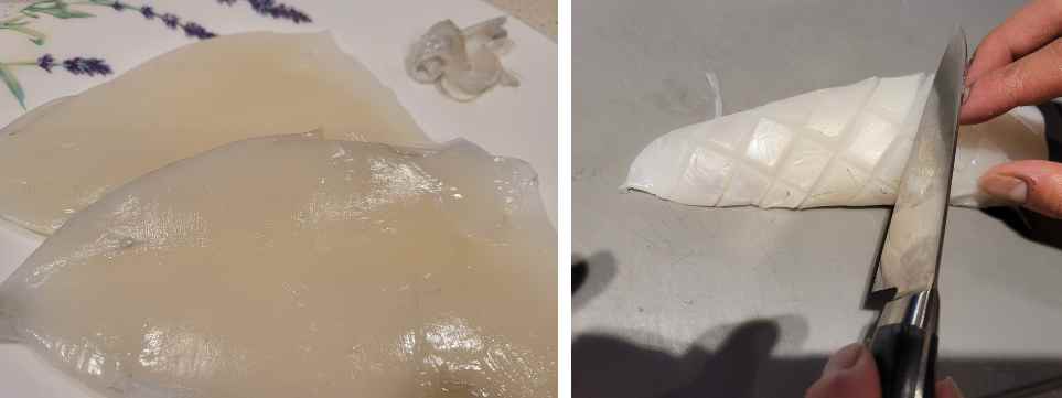 👉 갑오징어는 내장을 제거하고 깨끗이 손질한 후, 먹기 좋은 크기로 칼집을 넣어주세요. (칼집을 넣으면 익을 때 더 부드럽고 예쁘게 벌어져요!)