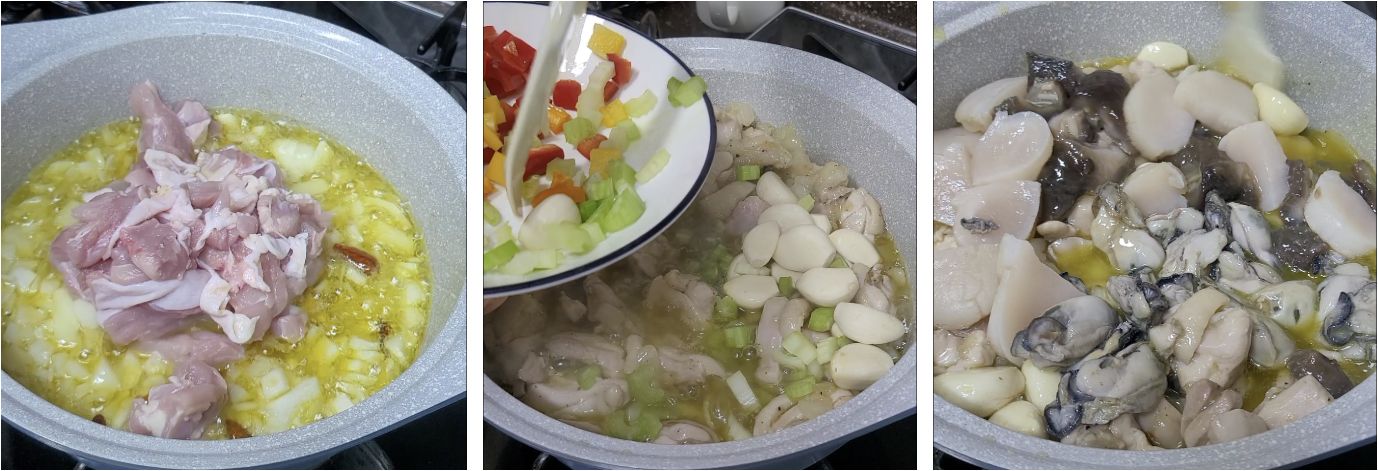 양파를 볶은 후 닭고기를 넣어서 단맛이 배게하고 통마늘을 넣어 마늘향을 입힙니다. 여기에 해산물을 넣어 다시 살짝 볶아내죠! 향과 맛이 어우려저 너무 맛나지 않을까요!