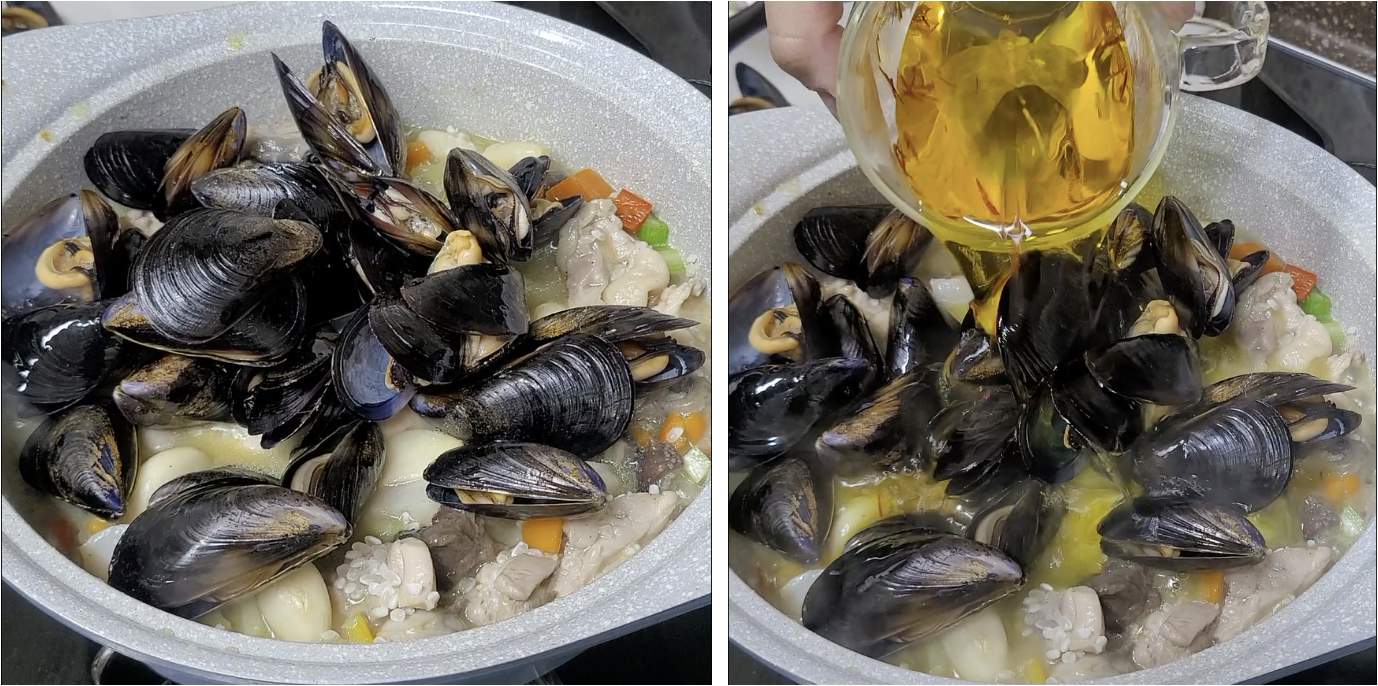 마지막 단계로 홍합과 우려낸 샤프란 물을 넣습니다. 크게 어렵지 않게 지중해 요리가 완성되어 가고 있어요. 여러분이 보기에도 쉽죠! 금방 따라 할실 수 있어요!