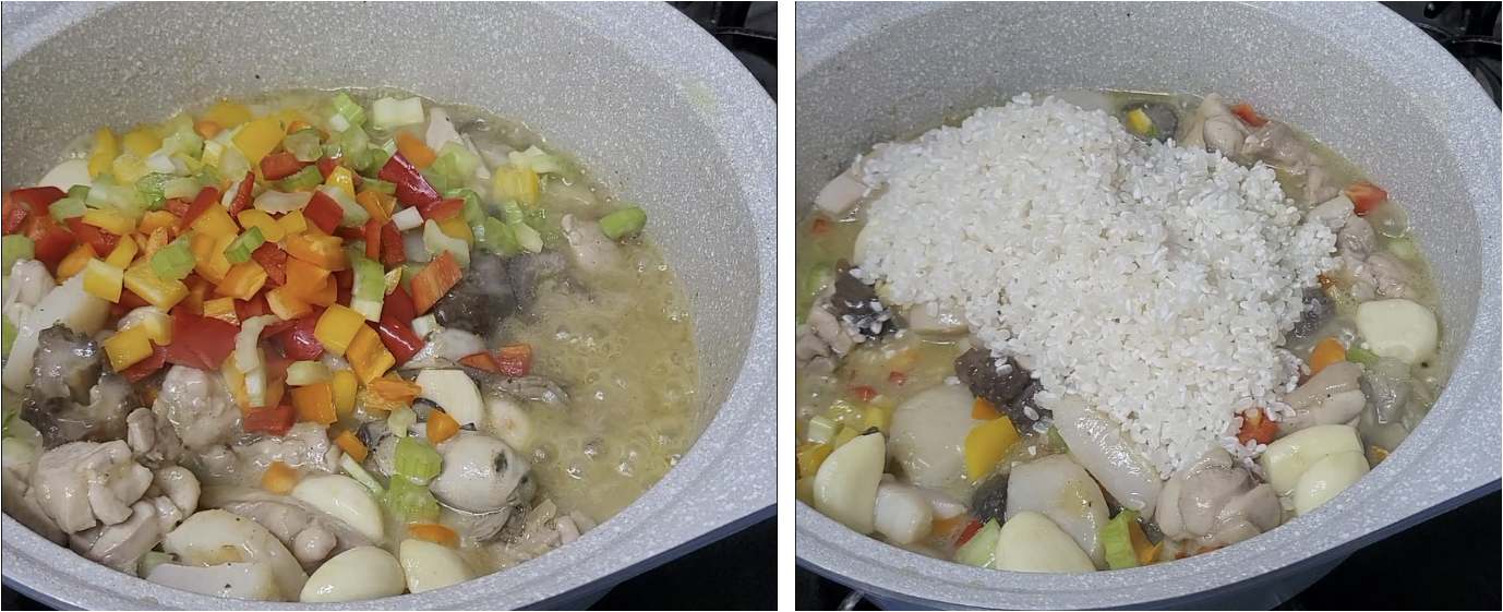 작게 썰은 야채와 불린 쌀을 넣어서 육수가 잘 스며들게 합니다. 국물이 조화를 이루어 정말 맛나지 않을까요!