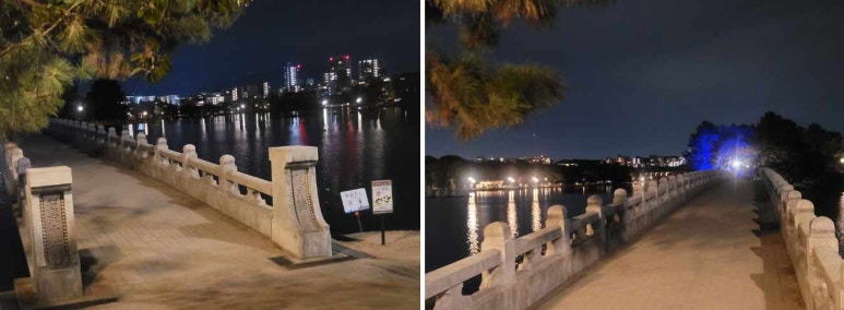 북쪽의 관월교, 중앙에 송월교, 남쪽에 오월교가 연결되어 호수를 양분하고 있어요.