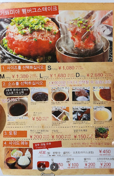 ㅇ 특징 : 작고 아담한 햄버그스테이크 전문점인데, 고기만 다져서 양념하여 주먹만 하게 내어주는 곳으로 뜨거운 철판에 얹어서 익혀 먹는 집입니다. 현지인 등 매우 사람이 많으며, 생맥주와 함께 저녁 시간을 즐기는 사람들이 많았습니다.