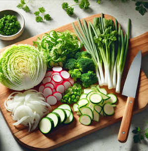 배추, 무, 양파, 대파, 미나리, 애호박은 먹기 좋은 크기로 썰어줍니다.