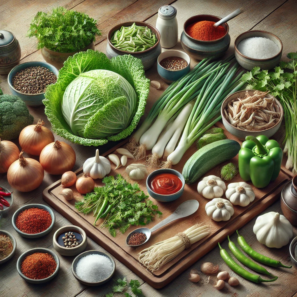 ✔️ 배추, 무, 양파, 대파, 미나리, 애호박, 청양고추 ✔️ 고춧가루 3큰술 ✔️ 고추장 2큰술 ✔️ 간장 2큰술 ✔️ 다진 마늘 1큰술 ✔️ 된장 1큰술 ✔️ 소금 & 후추 (간 맞추기용) ✔️ 다시마, 멸치, 건새우 (육수용) ✔️ 팽이버섯, 느타리버섯 (옵션)