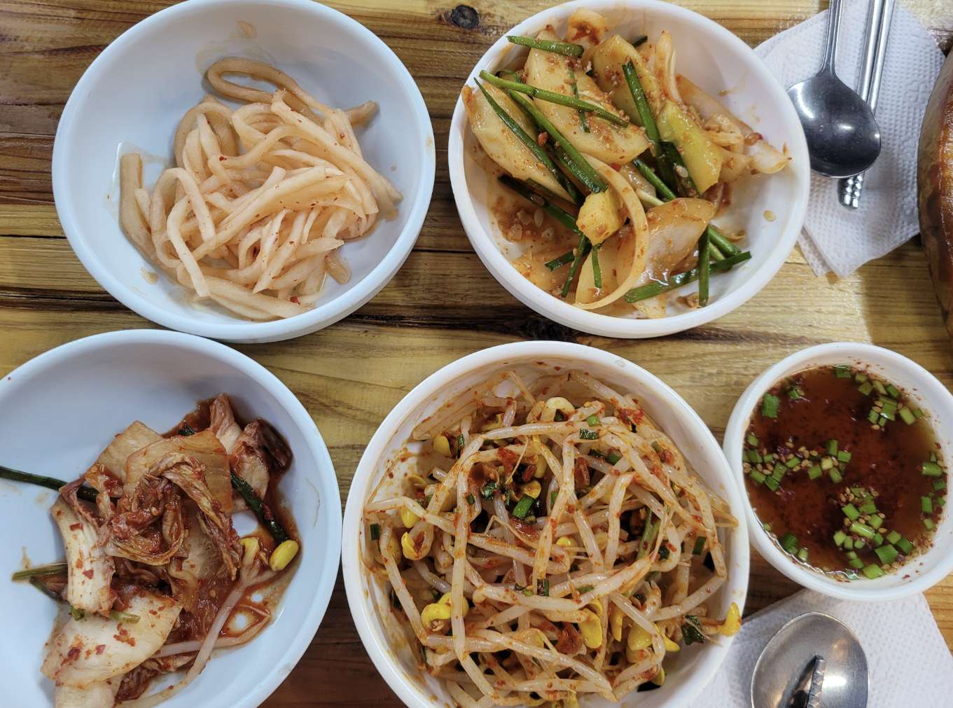 기본으로 나오는 상차림이에요. 무나물, 콩나물, 김치와 오이나물이 나오고 추가는 셀프 서비스랍니다. 소박하지만 정갈하고 푸짐해서 입맛이 당기지 않으신가요!