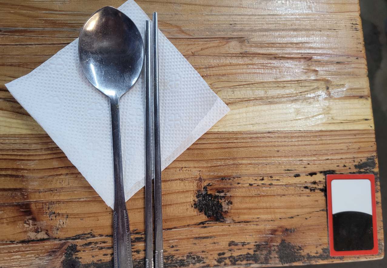 눈치 채셨나요? 식탁 한끝에 화투 한장이 놓여 있어요. 무엇일까요? 맞아요 8이랍니다. 테이블 번호를 화투를 이용해서 표시하고 있네요, 처음보고 뭐지 하다가 이내 실소를 금치 못했답니다. 정말 재미있는 장터다운 재치 아닌가요!