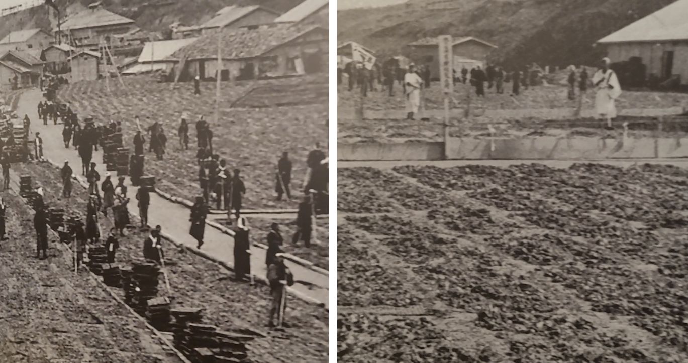 오비라 니신반야 지역은 예로부터 청어(니신) 어업이 매우 발달했던 곳으로, 홋카이도 어업 역사의 중요한 거점 중 하나입니다. 바닦에 깔린 것이 모두 청어로 건조 중인 사진이에요.