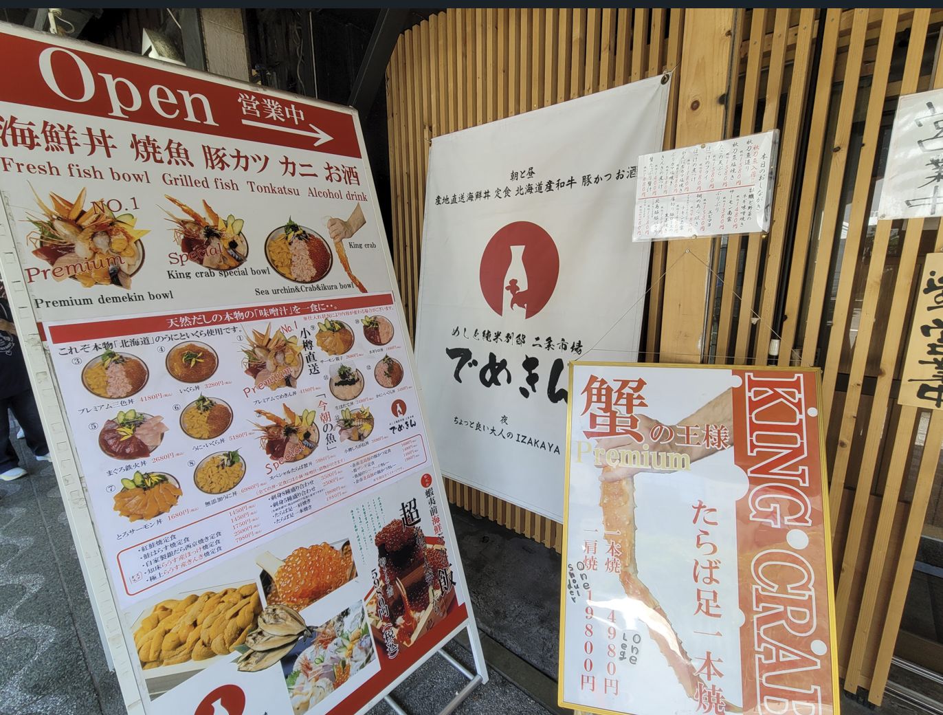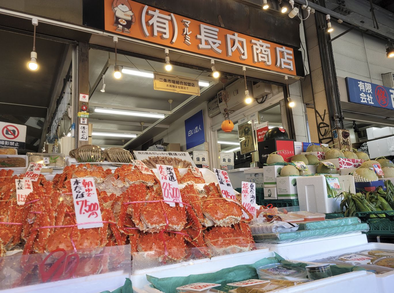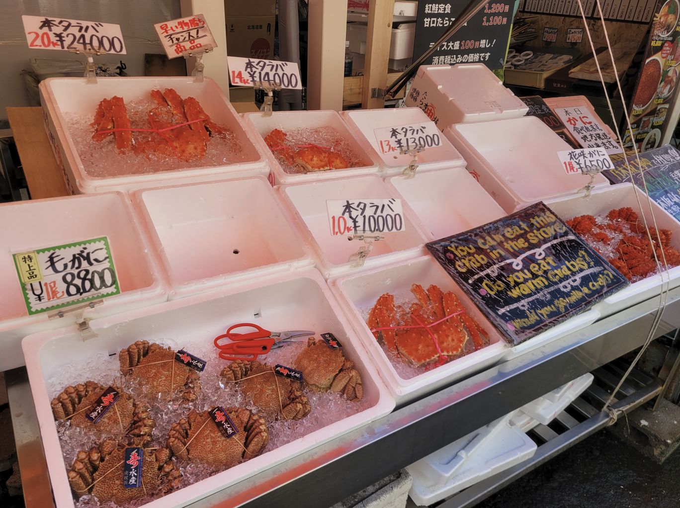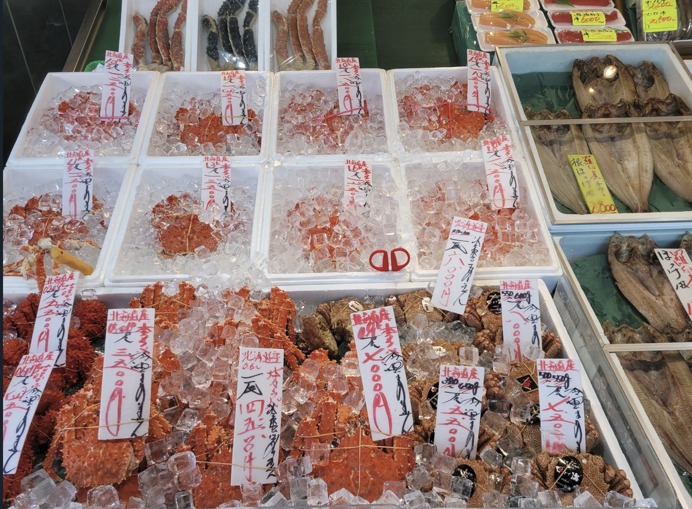가게마다 큼직한 수조와 얼음 위에는 홋카이도를 대표하는 해산물들이 화려하게 진열되어 있었는데, 특히 눈길을 끌었던 것은 붉은빛이 강렬한 **레드 킹크랩**과 홋카이도에서만 볼 수 있는 희귀한 하나사키 킹크랩, 그리고 진한 주황빛 껍질을 가진 털게였습니다.
