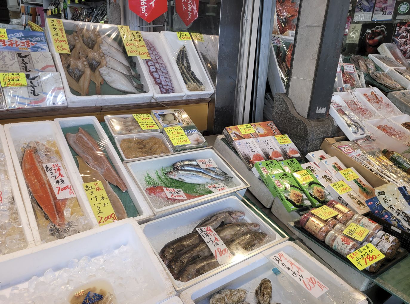 큼직한 가리비, 신선한 굴, 그리고 홋카이도에서 많이 잡히는 다양한 생선들도 함께 진열되어 있었습니다.