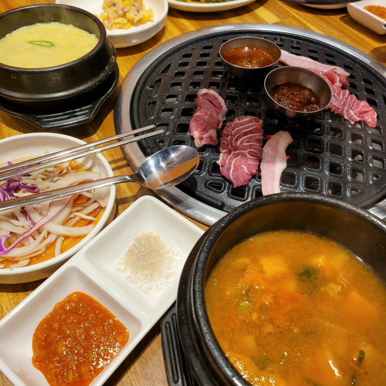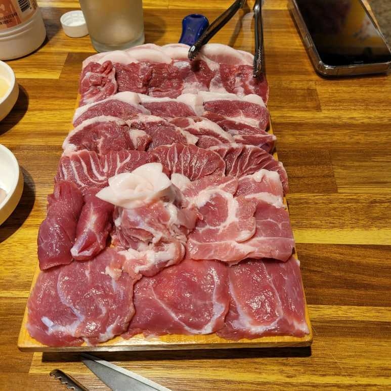 일단 모둠 한 판을 시켰는데 천겹살, 비단살, 논썹살, 뽈살, 꽃살, 돈새살 등 몰랐던 이름의 부위별 고기들이 한상으로 나왔다.