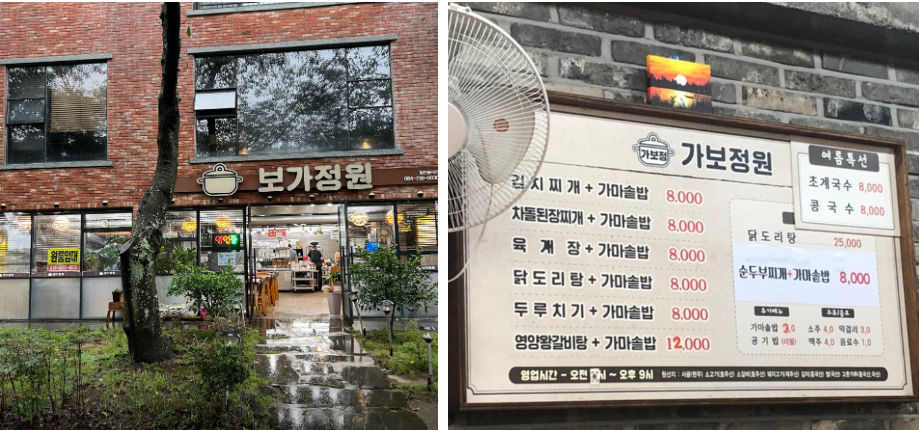 가보정원은 현지인들에게 인기있는 한식집으로 현재은 보가정원으로 개명하였으며, 왕갈비탕과 돌솥밥, 닭도리탕, 돼지 두루치기 등으로 집에서 먹는 것처럼 요리하여 판매하는데, 양도 많고 가격도 착한 음식점입니다.