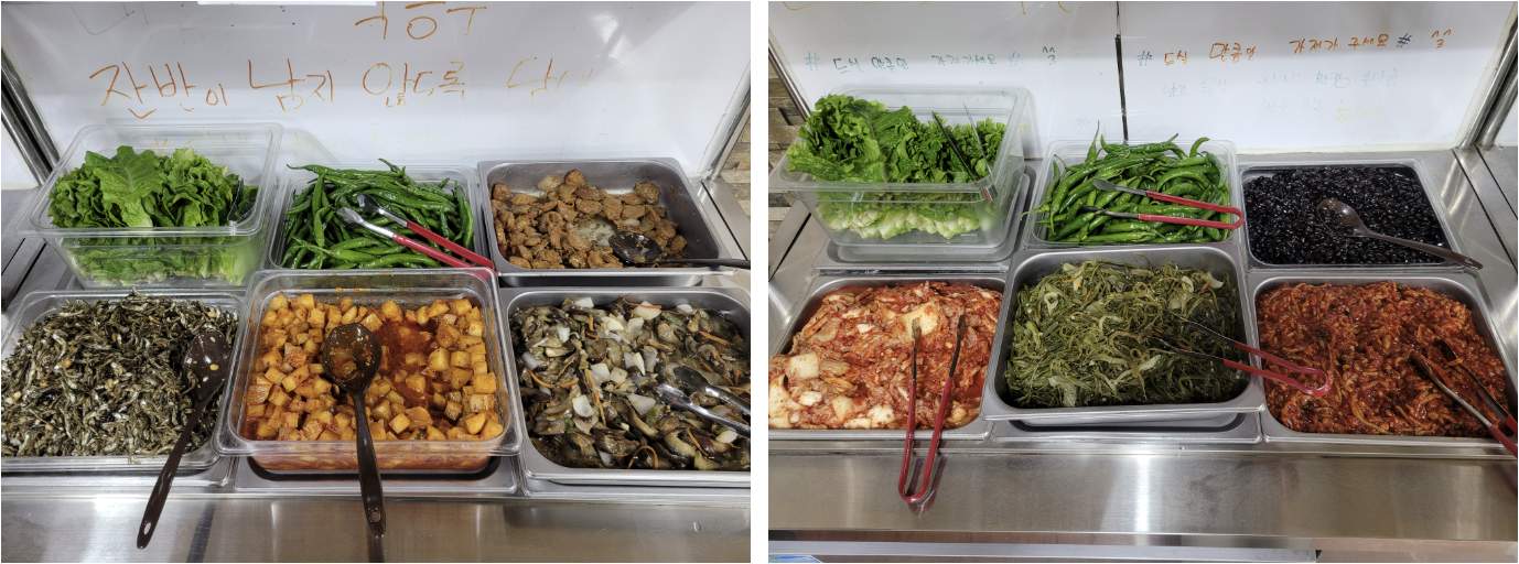 식당 한쪽에 반찬들을 준비하여 놓은 곳이 있어요. 손님이 많을 수록 계속해서 반찬을 조리하여 보충하기 때문에 신선하고 맛이 좋답니다. 아주 먹음직스럽지 않나요?